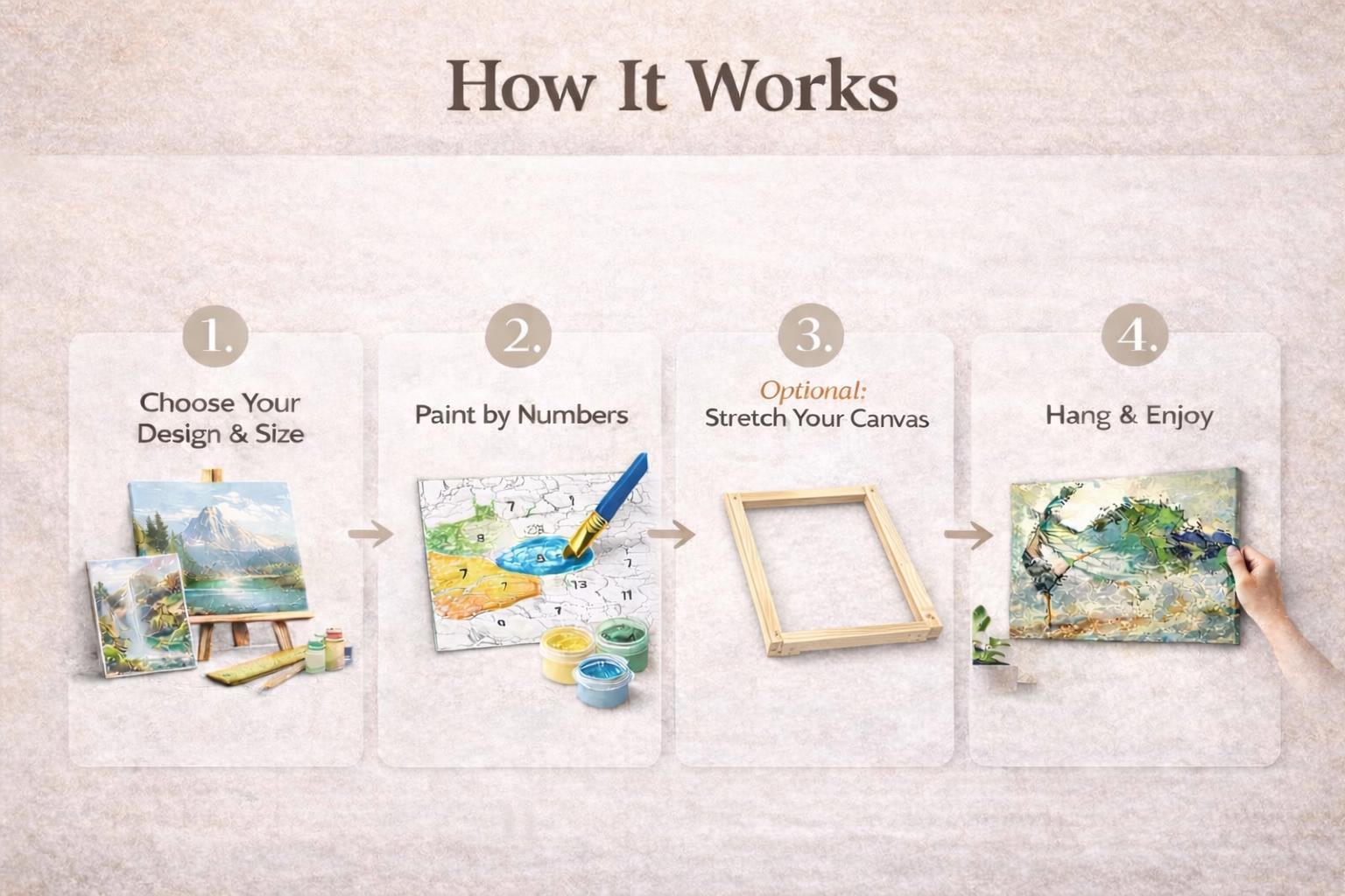 This Paint by Numbers kit requires no prior painting skills, you'll easily create a beautiful finished painting you can display in your home and have fun along the way.