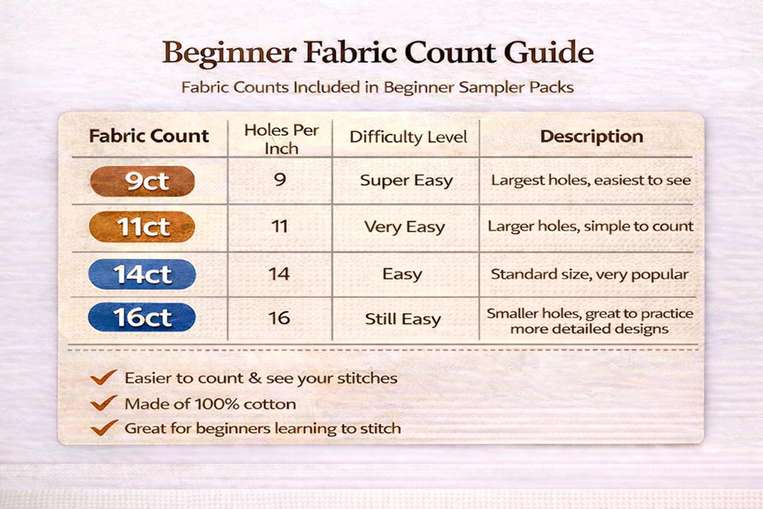 Lower count = larger holes = easier stitching