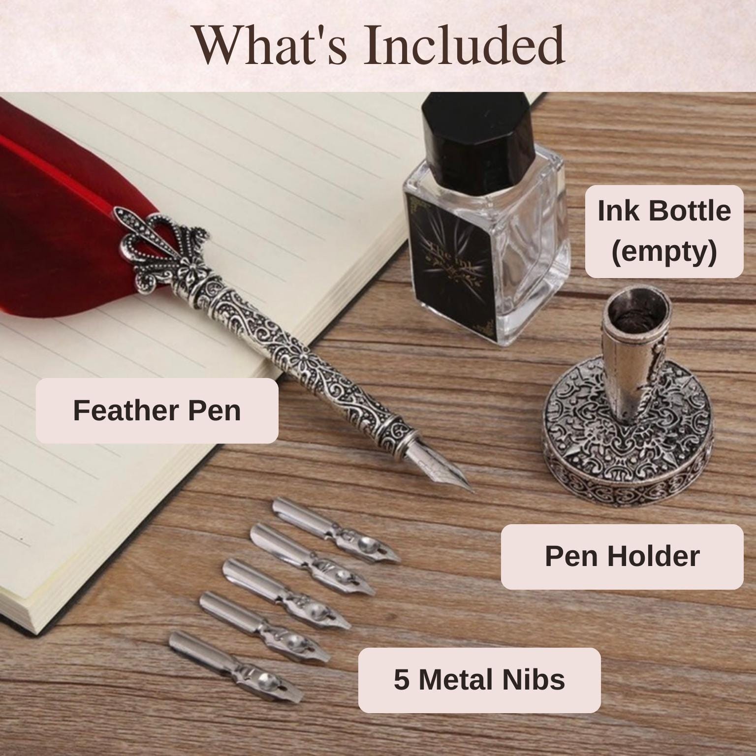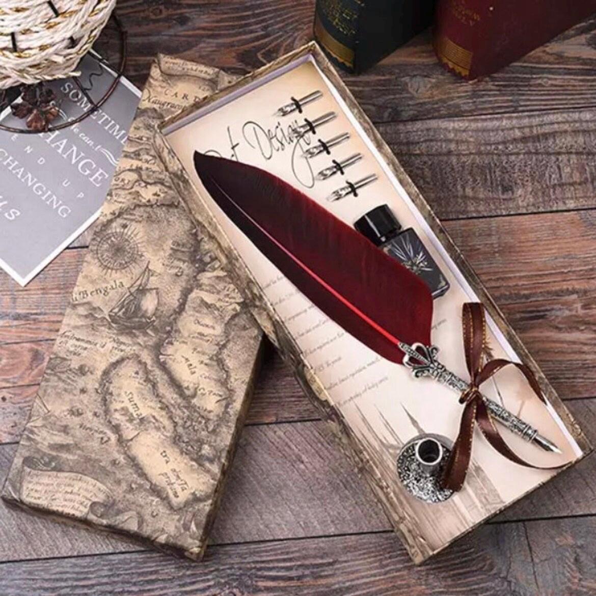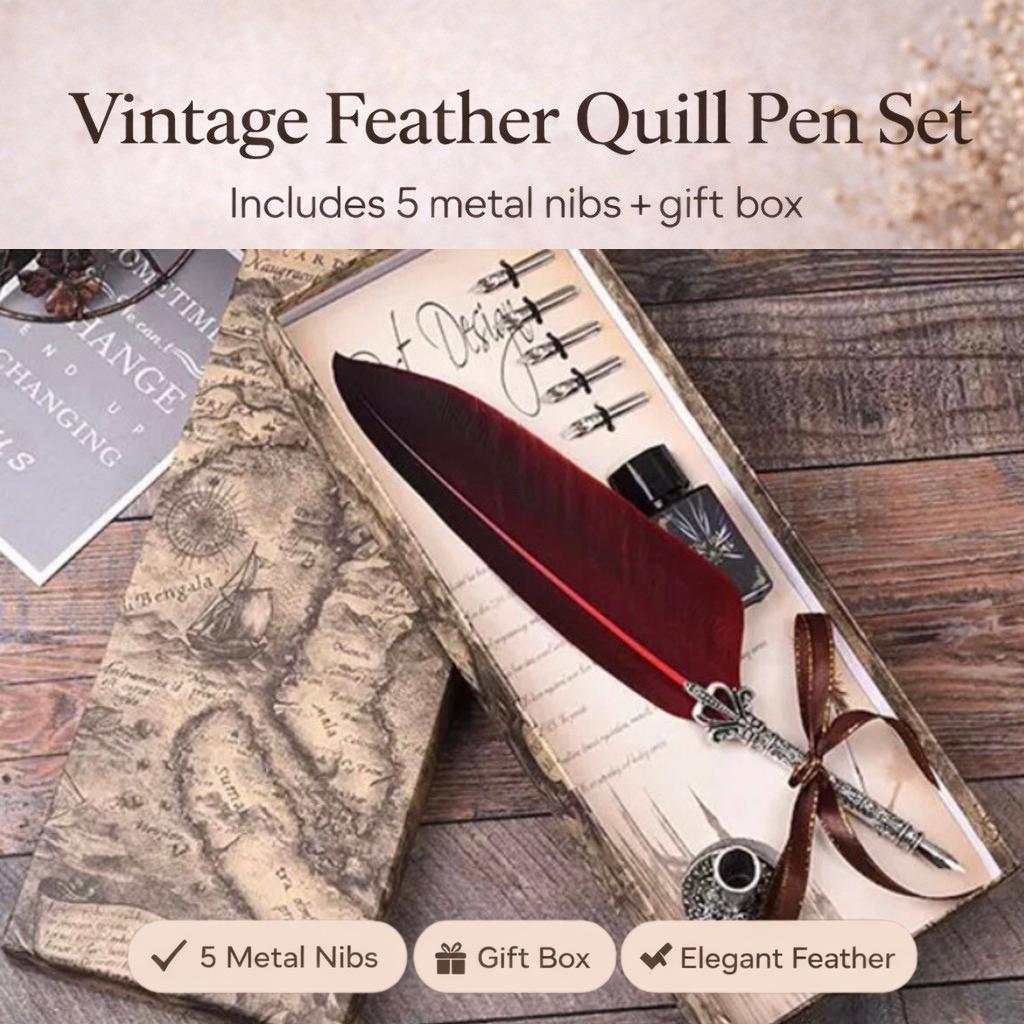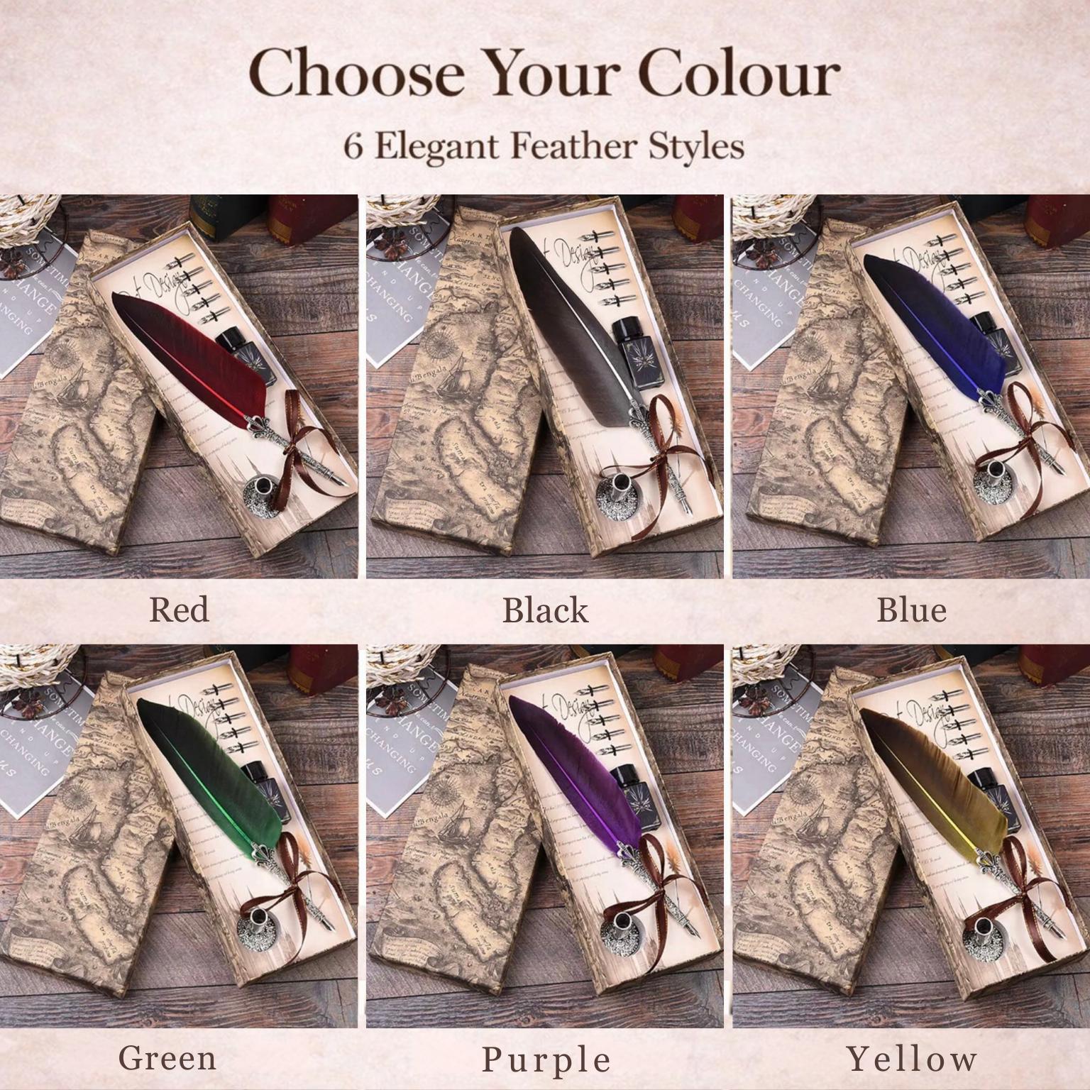 This feather dip pen set comes with 5 replacement dip pen nibs for a great variety of writing projects.